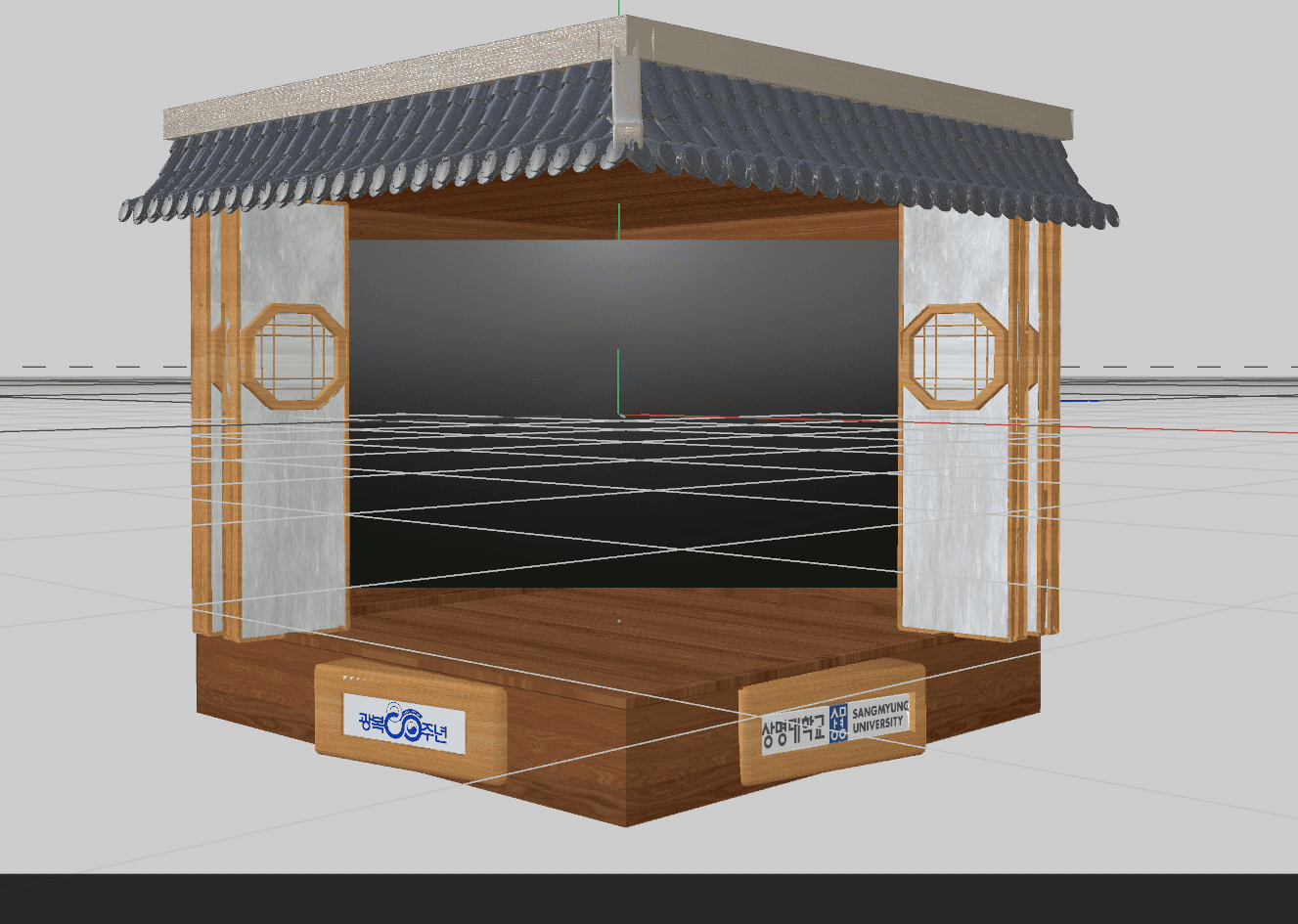 한옥 스타일의 전통적인 구조물을 보여줍니다. 이 모델링은 한국 전통 건축의 아름다움을 담아 영상의 배경이나 주요 장면의 틀로 사용되었습니다. 이는 독립기념관이라는 역사적 공간의 한국적 정체성을 시각적으로 확립하고, 영상의 입체감을 더해 시청자에게 더욱 깊은 몰입감을 제공하는 역할을 합니다.